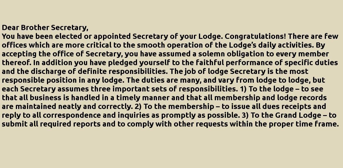 LodgeHelper is an innovative, full-featured solution that's designed for managing all the Grand Lodges' aspects of collaborative interaction with it's subordinate lodges. It uses relationship management technology to organize, automate and synchronize business processes - principally lodge activities, such as District Deputy reporting, Lodge Secretary reports, new petitions, reinstatements, and detailed information for each brother.